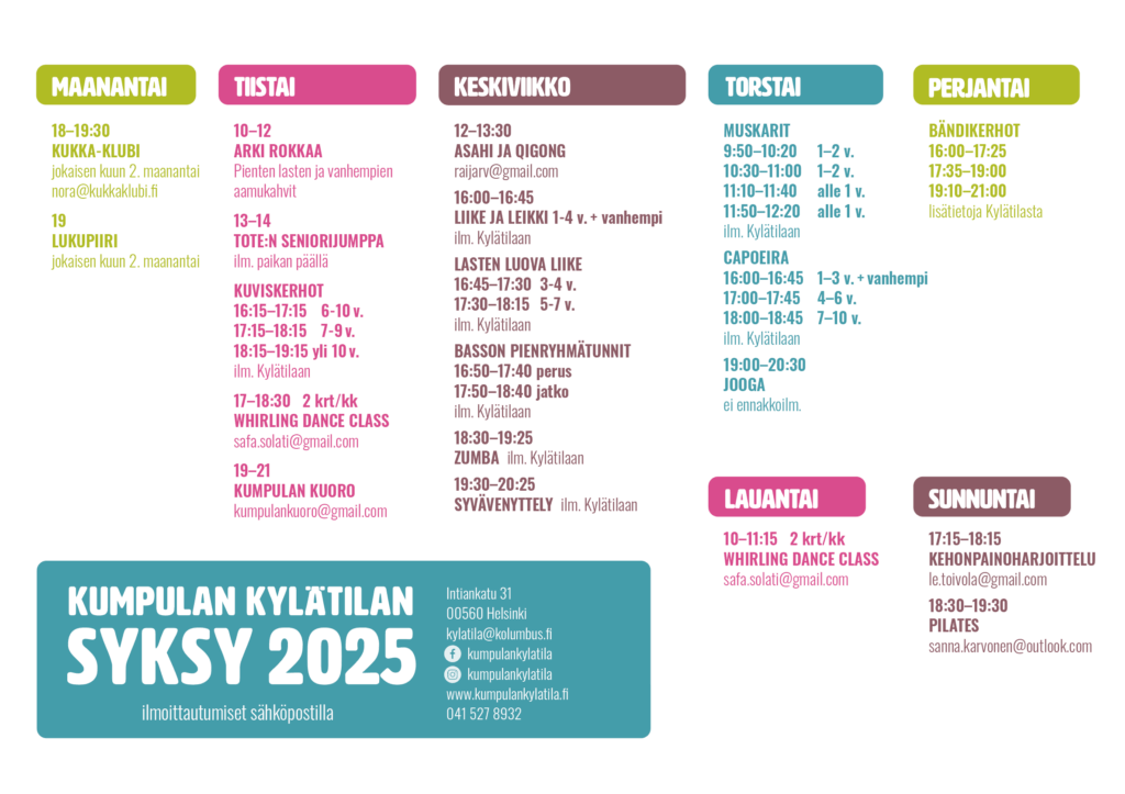 Kumpulan Kylätila on alueen oma asukastalo, jossa järjestetään kerhoja, kursseja ja tapahtumia kaiken ikäisille lähialueiden asukkaille. Tule mukaan! Lasten kerhot Tapahtumat Kurssit Aikuisten kerhot Syksyn lukkari Tuoreimpia lisäyksiä